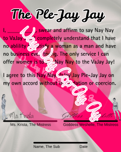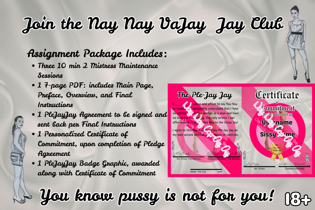 Pussy and the pursuit of it seems to be a huge part of patriarchal masculinity. According to modern gender norms, men are only really men if they can properly please a woman with their cock. This standard doesn’t take into account women’s pleasure, and it puts unnecessary emphasis on cocks. This combination leads to a lot of anxiety and frustration for men, which absolutely leads to performance issues and dissatisfaction in the bedroom. For these reasons, Krista and I created the NayNay VaJayJay PleJayJay. By swearing off pussy, forever or for a shorter amount of time, the mental load of pleasuring a woman is immediately lifted. Not only that, but it also frees up space in the cock-havers mind to focus on non-dick related pursuits. Things like, learning emotional intelligence, how to be more supportive of the women in your life, taking up a new hobby and so on. Having a Femdom, like me and my bestie, to guide your chastity means that we’ll be the ones overseeing and guiding your non-dick related pursuits. As the old adage says, ‘Nothing ventured, nothing gained’ so if you’re willing to give up pussy, we’re willing to give you the full breadth of our domination.